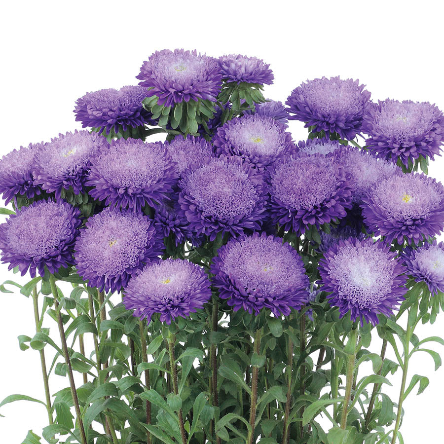 Aster Azumi XL Blue (Callistephus chinensis) is a tall, elegant annual aster known for its large pompon-style blooms and striking blue color — a hue not typically found in chrysanthemums. Each flower measures 7–7.5 cm in diameter and opens gradually into a full, rounded form with long shelf life. The Azumi XL series produces strong, uniform stems that are easier to grow to height than the Matsumoto or Bonita series and features a top-flowering, spray-type habit ideal for professional cut flower production. With intermediate resistance to Fusarium and a consistent bloom set from late summer through fall, this variety delivers reliable color and form to both garden beds and floral arrangements.
