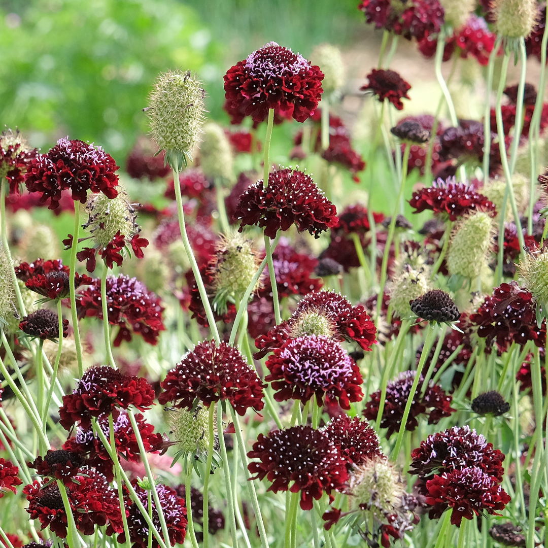 Black Knight Scabiosa (Scabiosa atropurpurea) is a striking, tall annual that produces deep, velvety maroon-black blooms atop strong, slender stems. The rich, dramatic color and soft pincushion form make it a favorite among flower farmers, florists, and gardeners alike.
