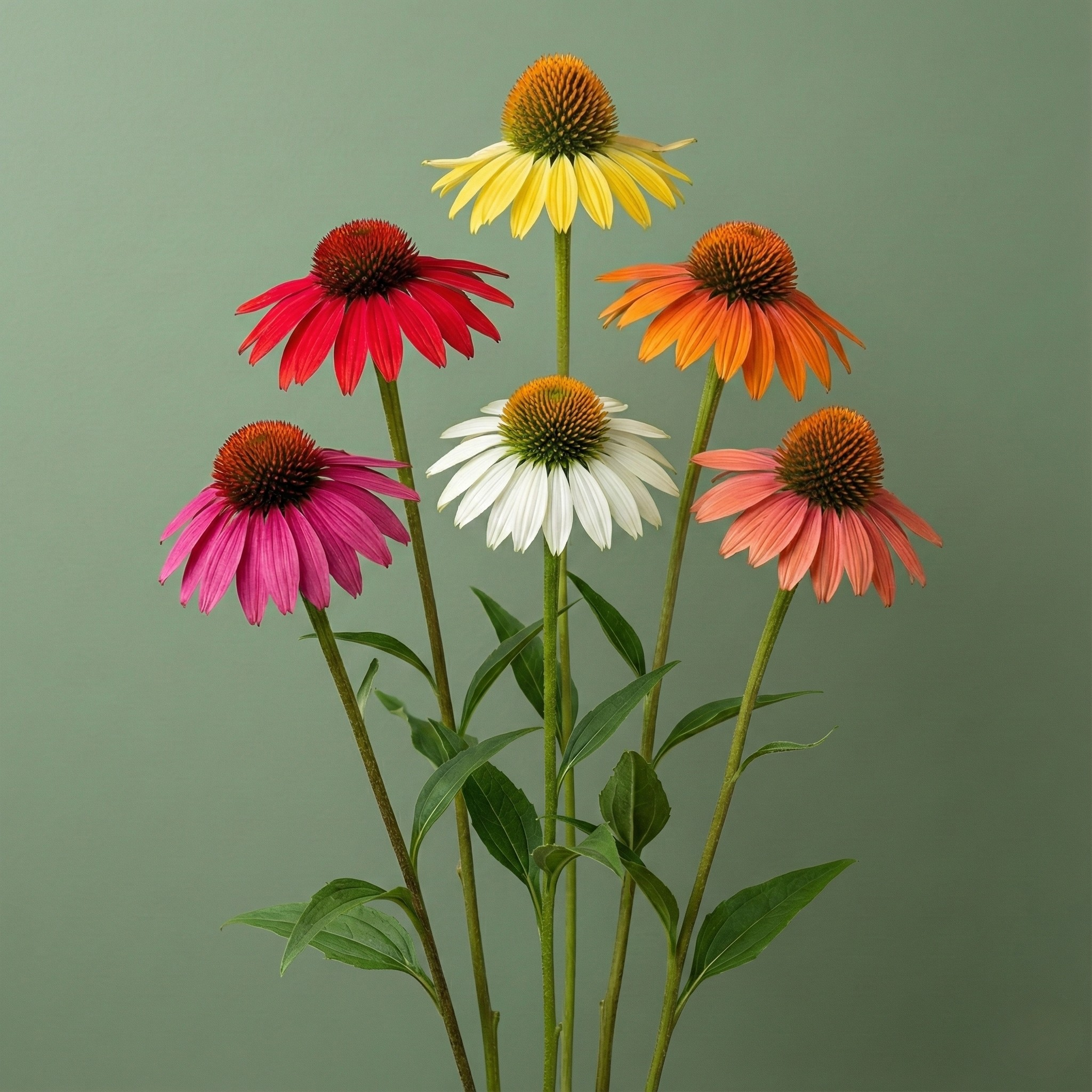 - Bright mix of coneflowers in pink, orange, yellow, red, and white