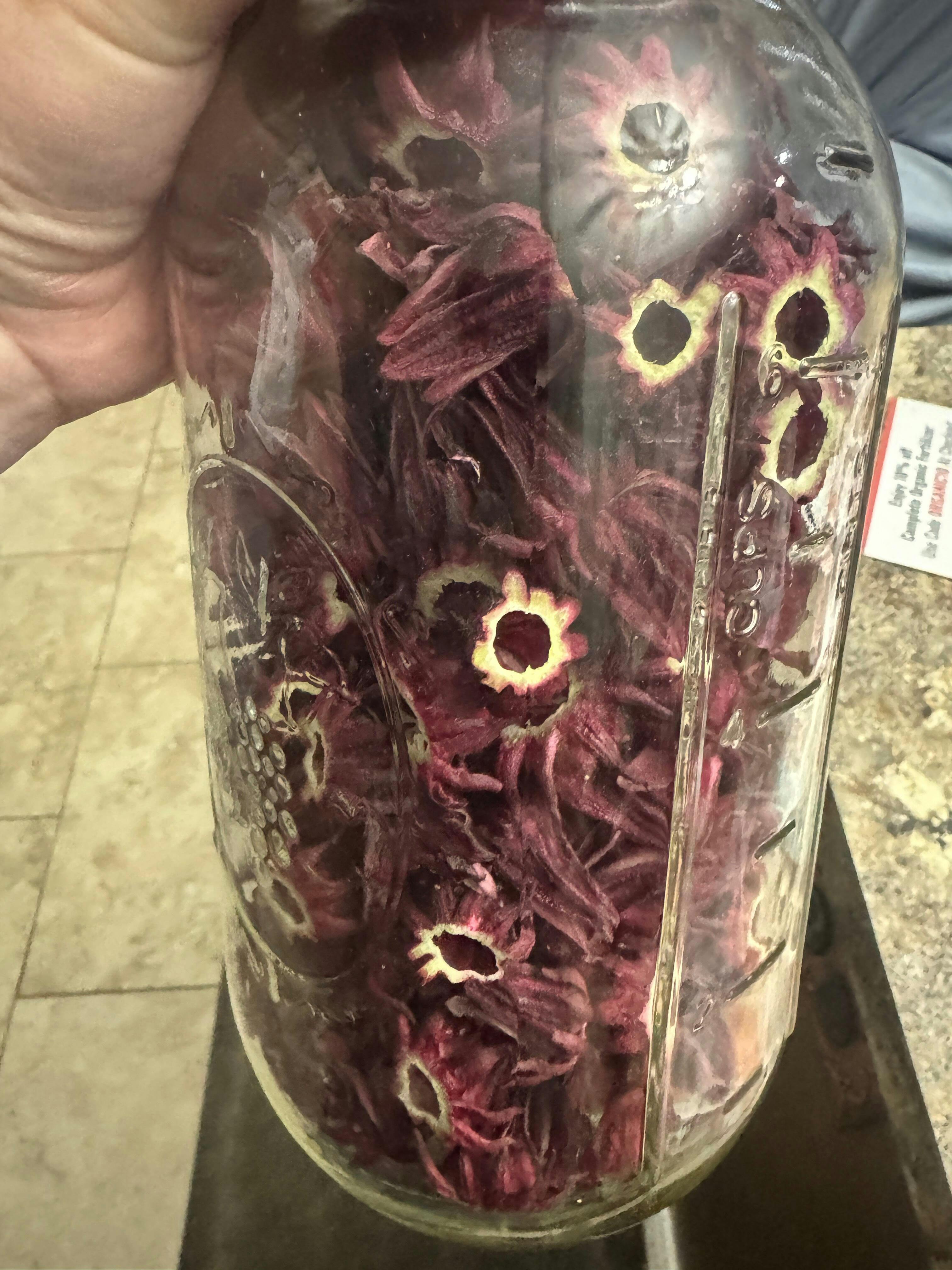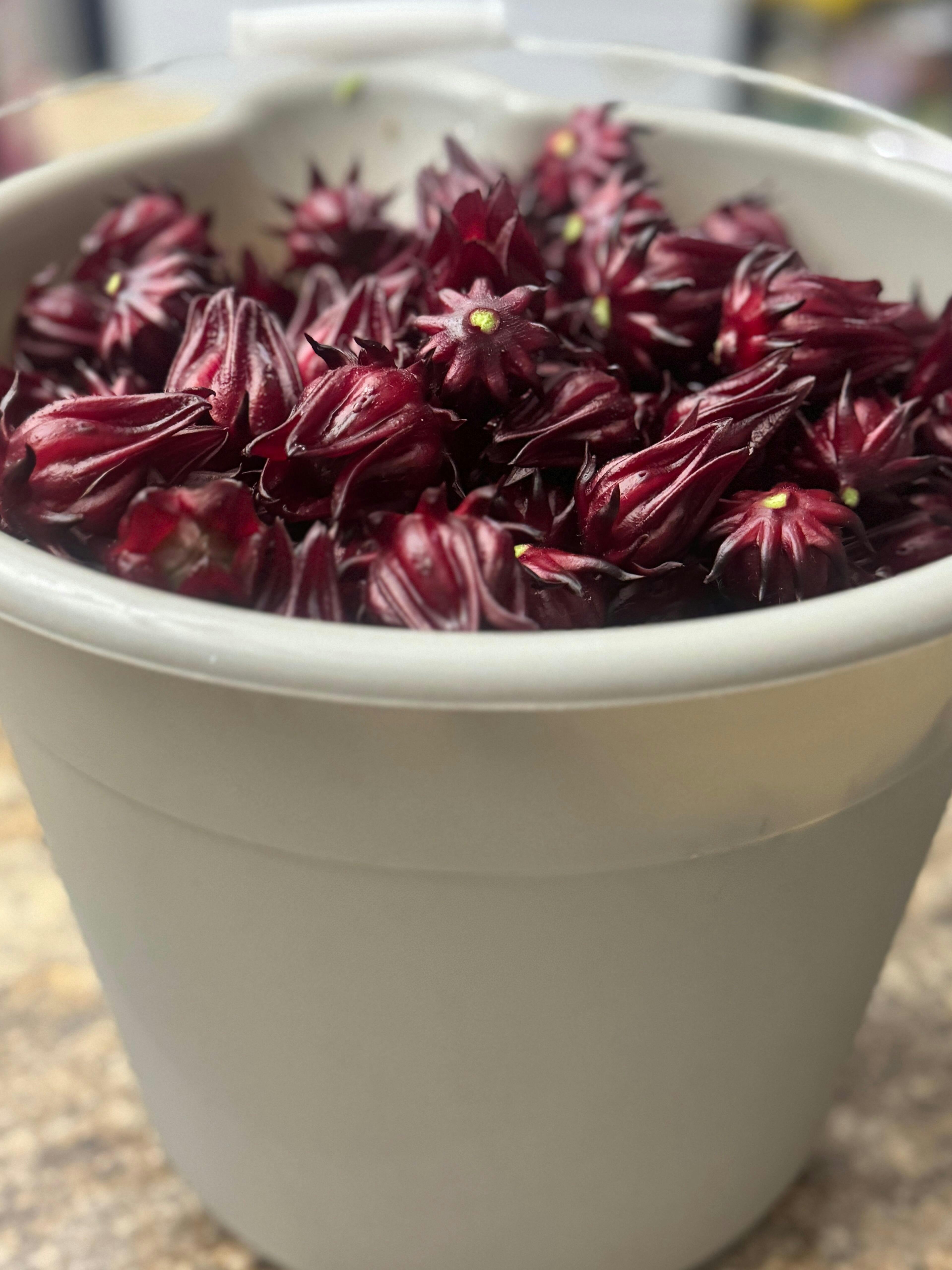 Once the seed pods are harvested, pull the dark red calyces from the seed pod. While they can be eaten raw, they make an incredible summer drink. The calyces may be dehydrated for later use, or use a mortar and pestle to release the flavors for making cold teas, tart jams, and sauces for almost any cooking application.