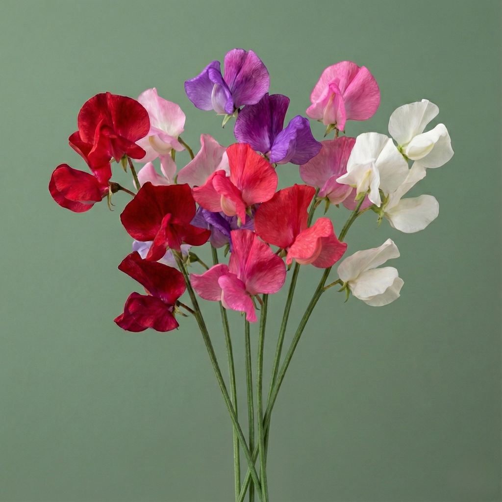 - Classic Sweet Pea mix with blooms in red, pink, lavender, salmon, and white