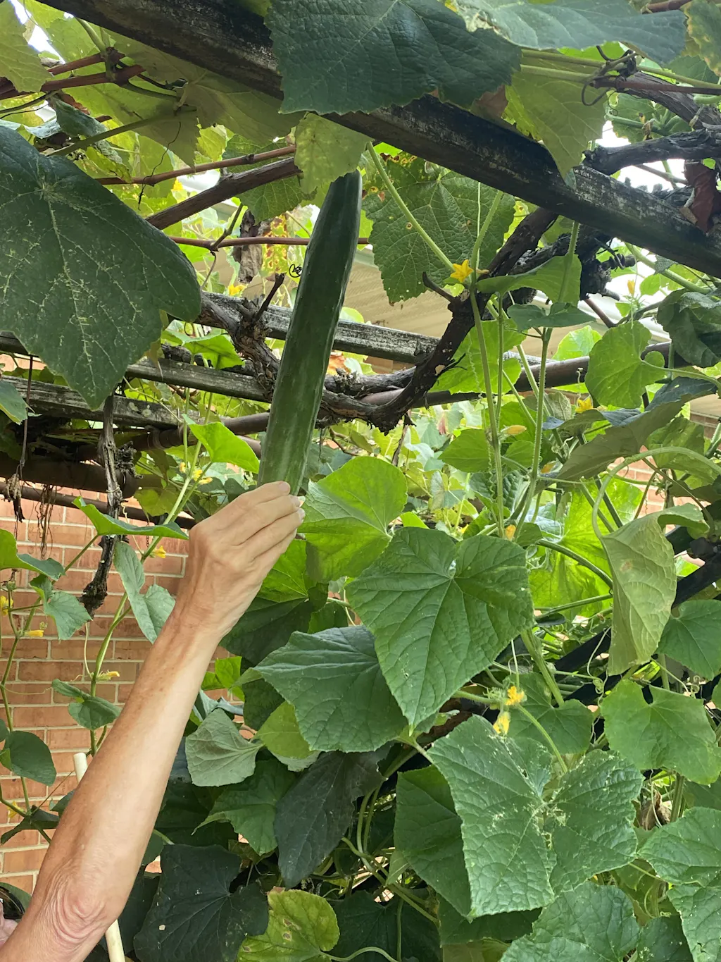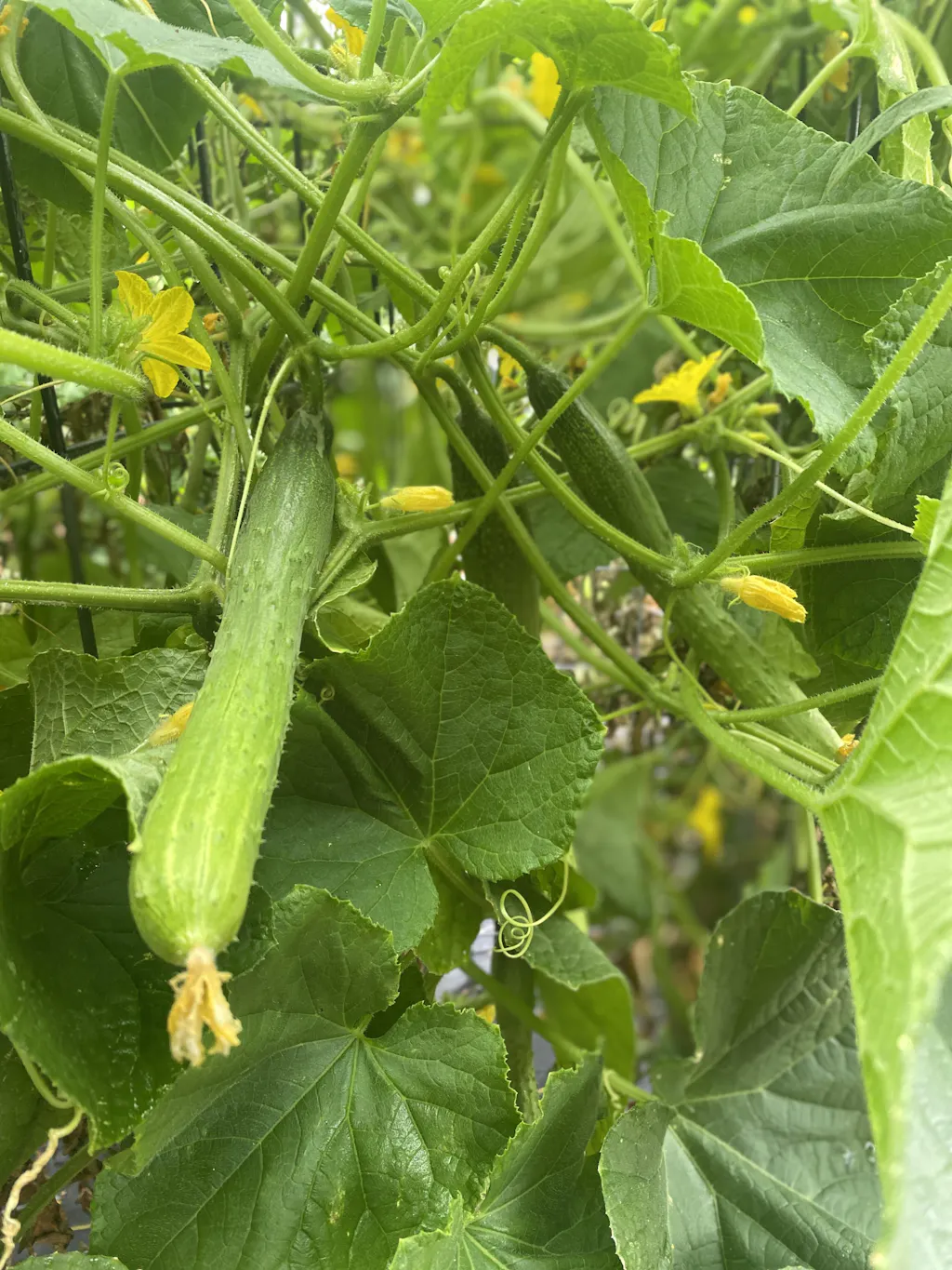 Cucumbers are a vining plant and grow best when given a trellised structure to climb. Use a strong trellis that is well-supported with deeply driven stakes. Keeping plants off the ground will reduce the potential of plant diseases like mildews and other diseases that can result from excess plant moisture.